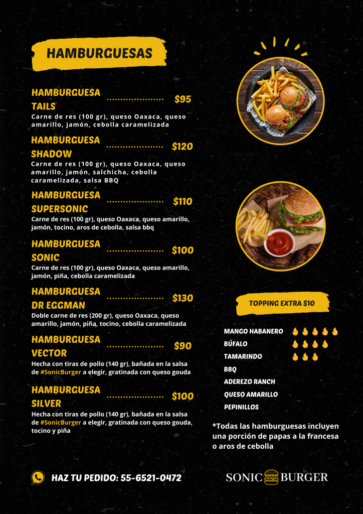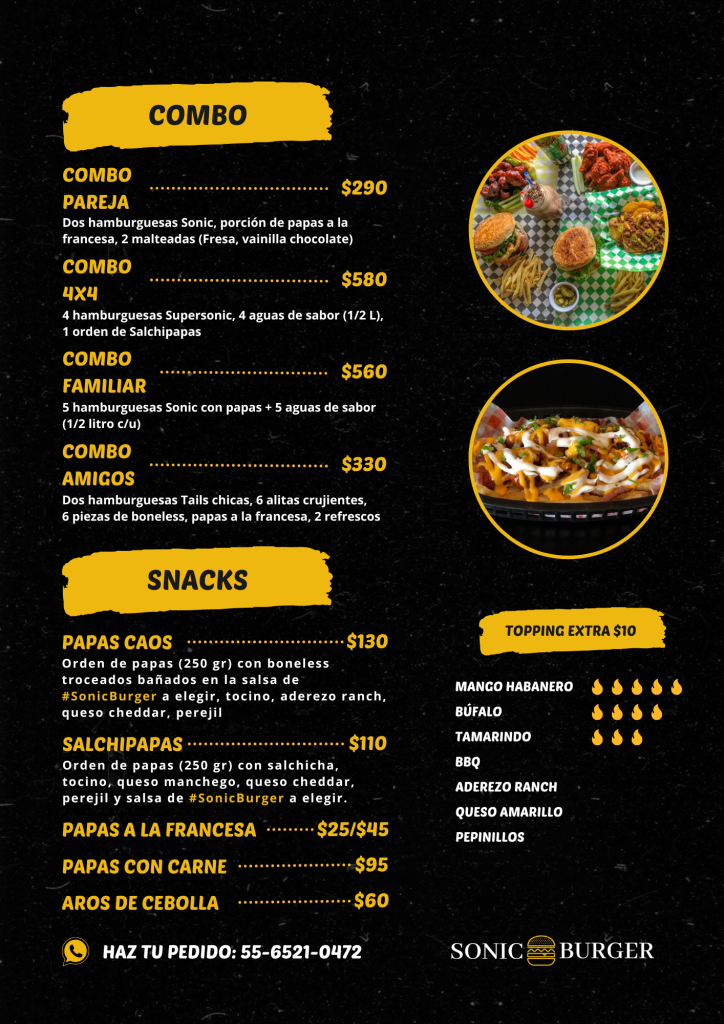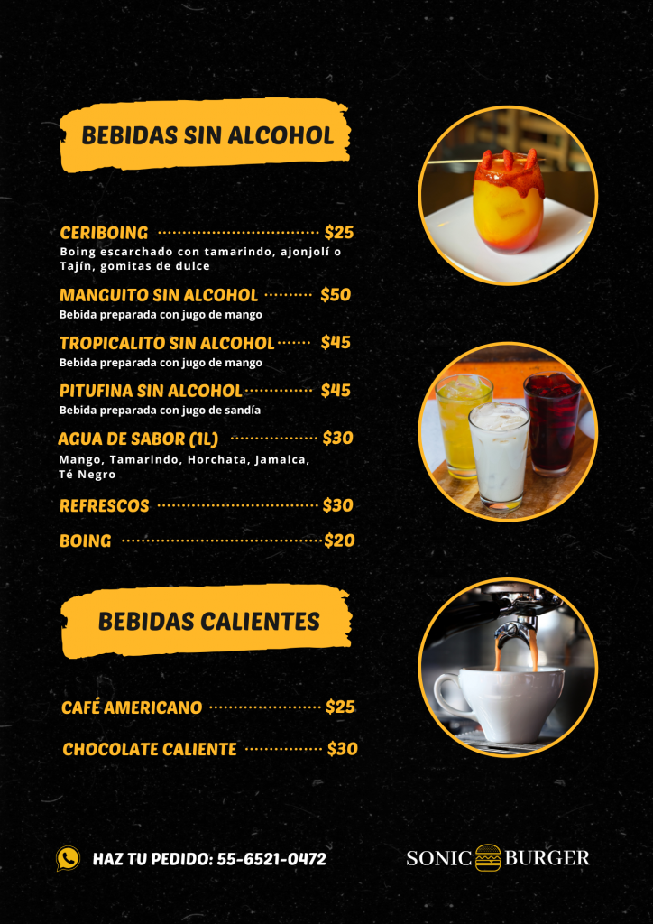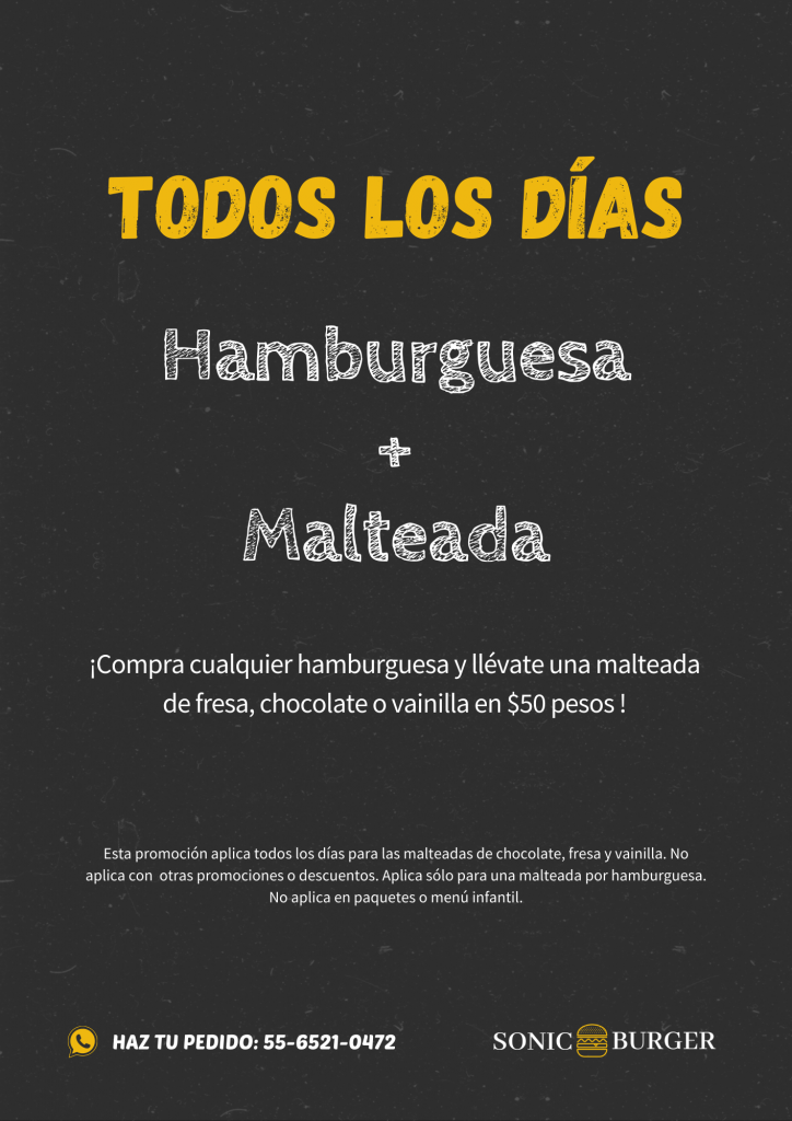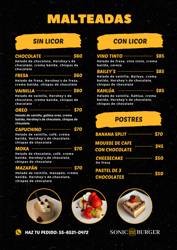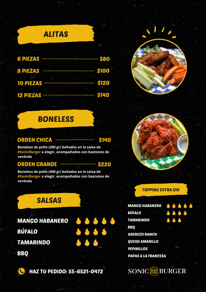 Conoce nuestro menú y ¡Prepárate para un festín de sabor único! Descubre el placer en cada mordisco con nuestras deliciosas hamburguesas, alitas crujientes y boneless con irresistibles salsas caseras. Además, sumérgete en el paraíso de las malteadas ¡Y mucho más!